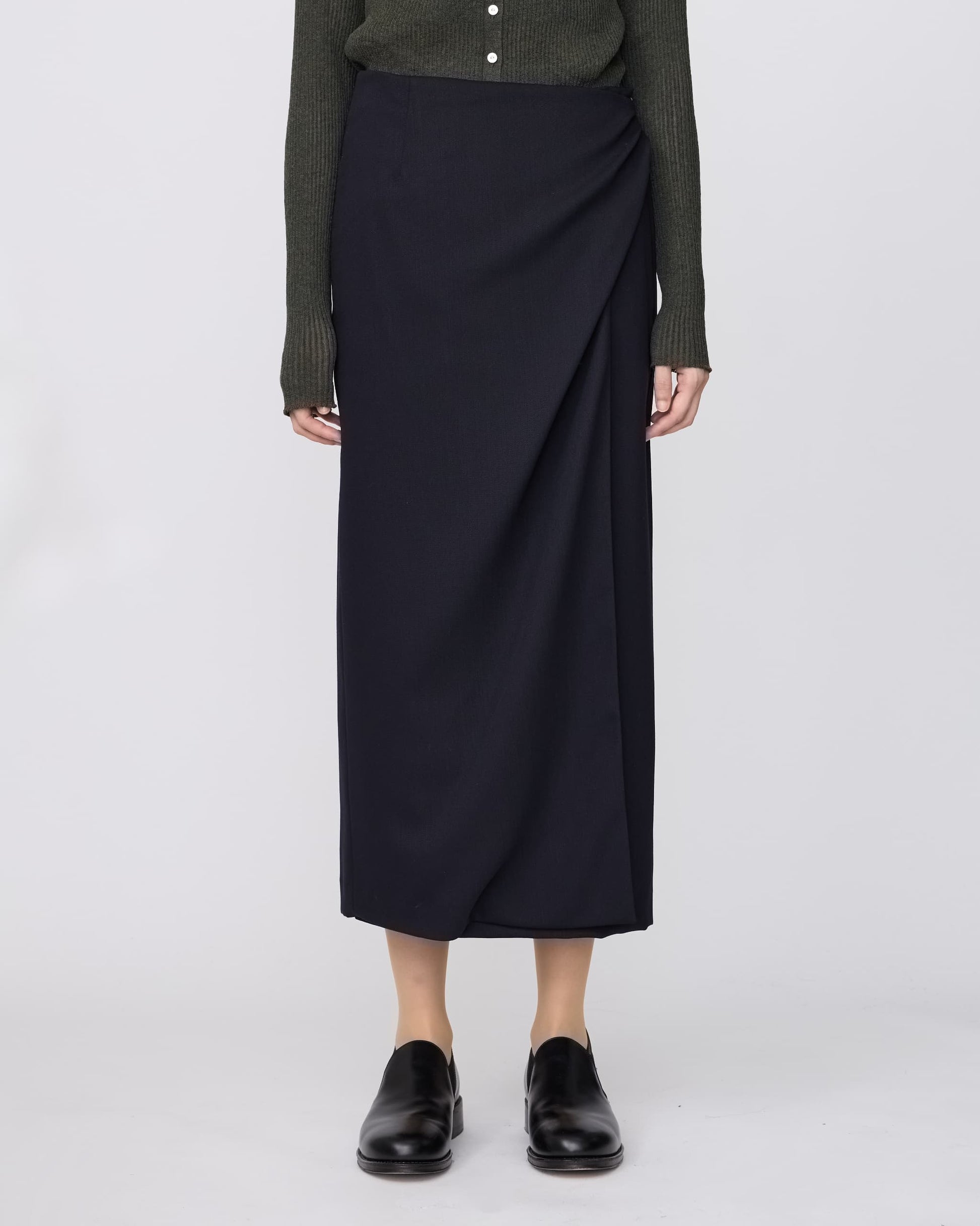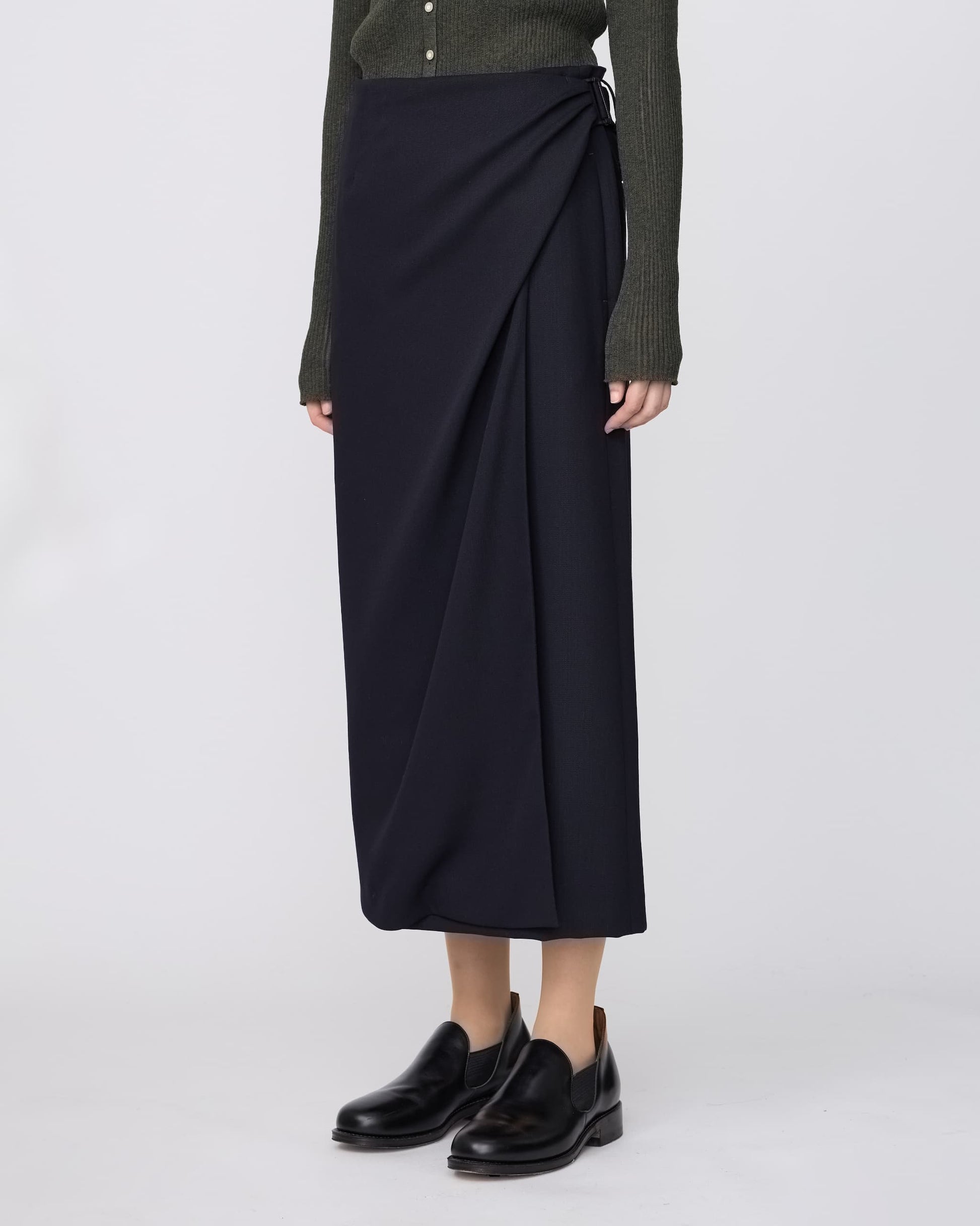 朱子織のウール素材を使用した、総裏のドレープシルエットのラップスカート